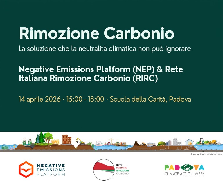 Questo evento è il primo appuntamento insieme alla Rete Italiana Rimozione Carbonio (RIRC), un'iniziativa nata per connettere i protagonisti del settore CDR in Italia. Co-organizzato da RIRC e dalla Negative Emissions Platform (NEP), la principale rete europea del settore, propone un pomeriggio di presentazioni, confronto e networking aperto a ricercatori, imprese, policy maker, investitori e a chiunque voglia approfondire il tema.