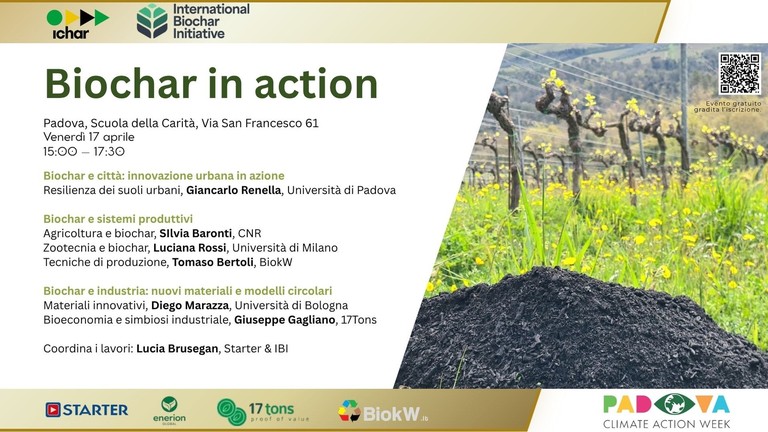 “Biochar in Action” è un evento divulgativo che, nell’ambito della Padova Climate Action Week, riunisce esperti, ricercatori e imprese per esplorare il ruolo del biochar nella rimozione della CO₂ e nelle sue molteplici applicazioni: dalla rigenerazione dei suoli all’agricoltura, alla zootecnia, dai materiali innovativi, fino alle soluzioni per le città e la bioeconomia circolare.