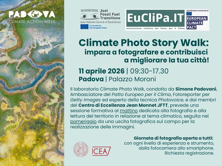 Jean Monnet JFFT: Il Jean Monnet Just Fossil Fuel Transition (JFFT) è un Centro di Eccellenza per la ricerca sulla transizione energetica dai combustibili fossili, co-finanziato dalla Commissione Europea. La sua missione è quella di produrre e diffondere conoscenza scientifica per supportare le politiche dell'UE di transizione green, favorendo il dialogo tra mondo accademico, società civile e istituzioni. In rappresentanza del JFFT, parteciperanno alla Climate Walk, Salvatore Pappalardo, Edoardo Crescini, Francesca Peroni, Massimo de Marchi, del Dipartimento di Ingegneria Civile ed Ambientale dell’Università di Padova (ICEA).