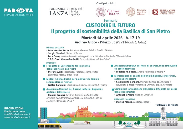 La Fondazione Lanza, centro studio in etica, con il Progetto Etica e Politiche Ambientali promuove un impegno culturale per orientare e motivare l’urgenza del cambiamento verso un sistema economico e sociale circolare e solidale (www.fondazionelanza.it).