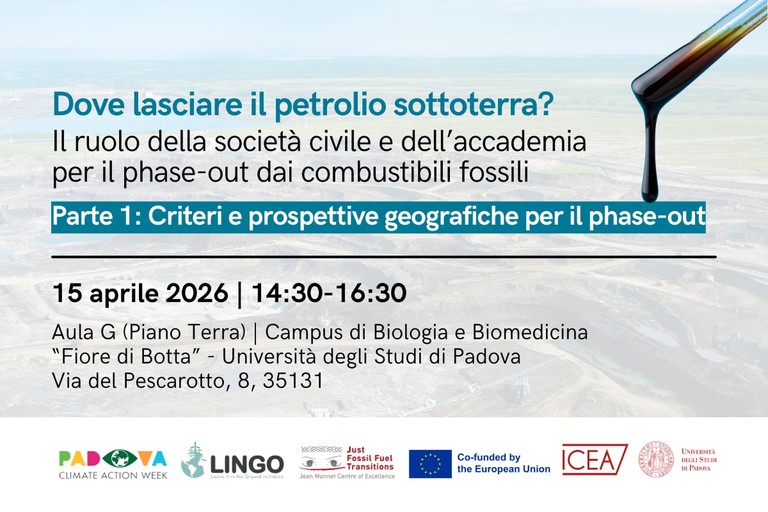 Presentazione delle ricerche relative alla tematica dell'Unburnable Carbon da parte del Centro di Eccellenza Jean Monnet on Just Fossil Fuel Transition e del Gruppo di Ricerca "Cambiamenti Climatici, Territori, Diversità" dell'Università di Padova, con un focus sulla questione italiana relativa al settore fossile.