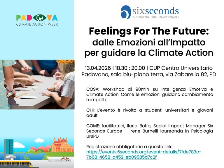 Six Seconds è un'organizzazione no profit a livello internazionale che ha la missione di allenare le persone alla pratica dell'Intelligenza Emotiva (EQ). Fornisce percorsi formativi sull'EQ per individui e gruppi in tutti i settori, utilizza EQ assessment / strumenti scientificamente validati per misurare e rafforzare le competenze chiave dell’Intelligenza Emotiva in adulti, giovani e bambini, produce ricerca e mira allo sviluppo di comunità locali e virtuali che agiscano collettivamente per supportare lo sviluppo di una società più giusta, equa ed inclusiva. Il focus strategico attuale è il benessere giovanile con particolare attenzione alla climate anxiety e alle emozioni che possono guidare un'azione climatica consapevole. Per maggiori info: