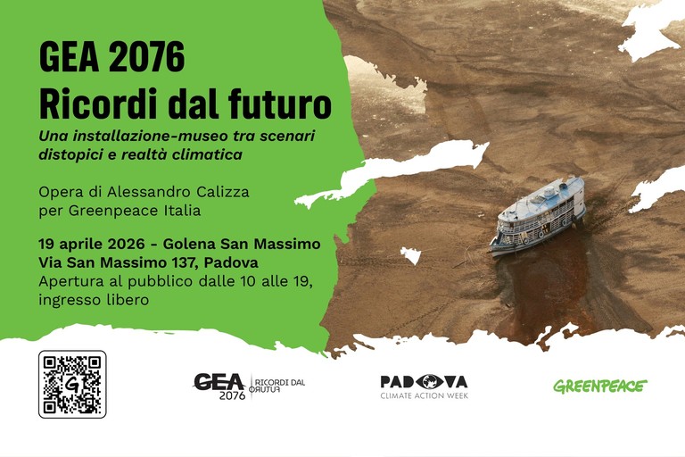È da questa visione che prende forma GEA 2076 – Ricordi dal futuro, la nuova installazione dell’artista Alessandro Calizza realizzata per Greenpeace Italia: una macchina del tempo narrativa che ci proietta in avanti di cinquant’anni per mostrare come gli effetti del cambiamento climatico e dell’inerzia dei governi si siano aggravati fino a generare una realtà distopica e allarmante.